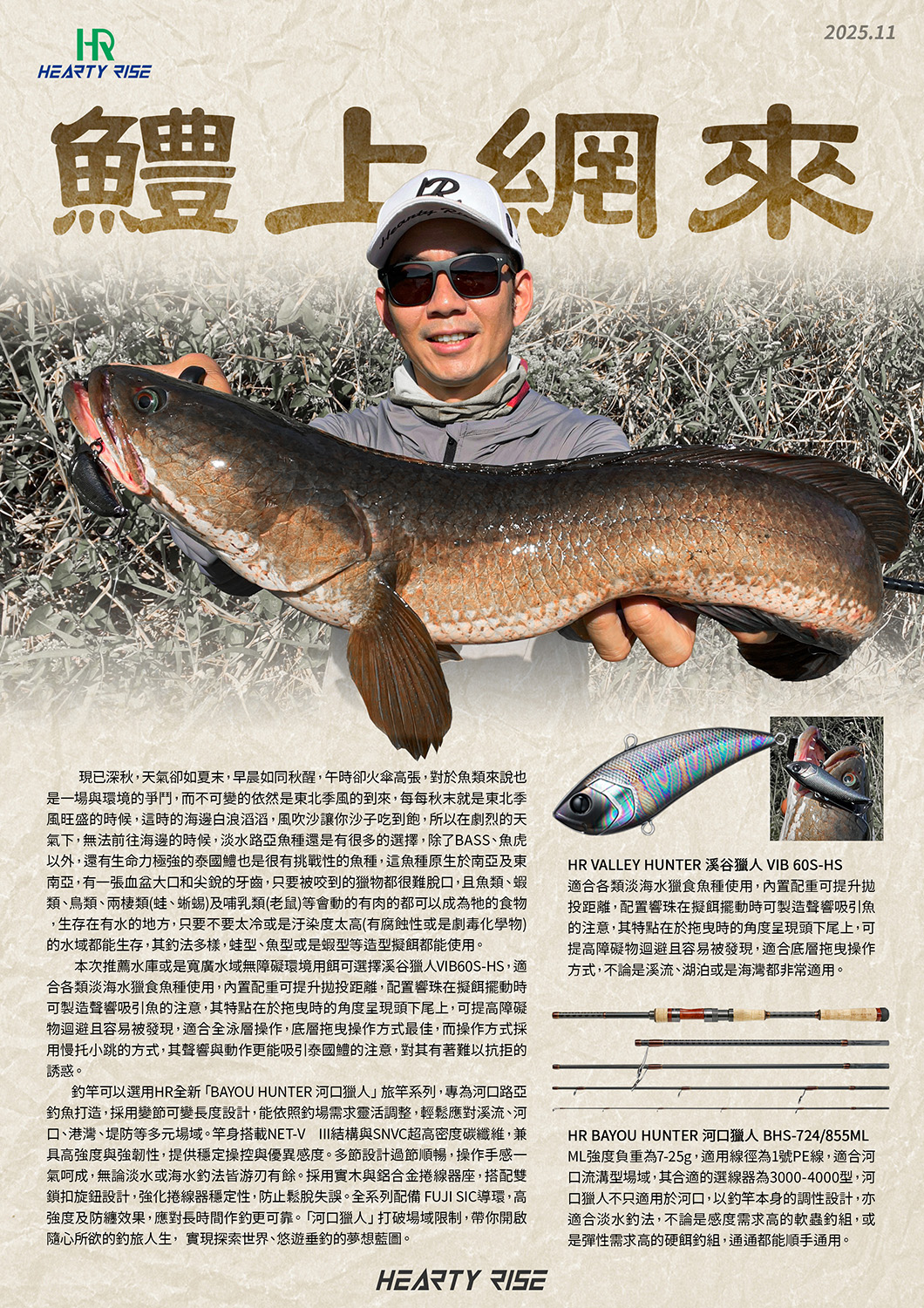 釣竿可以選用HR全新「BAYOU HUNTER 河口獵人」旅竿系列,專為河口路亞釣魚打造,採用變節可變長度設計,能依照釣場需求靈活調整,輕鬆應對溪流、河口、港灣、堤防等多元場域。竿身搭載NET-V III結構與SNVC超高密度碳纖維,兼具高強度與強韌性,提供穩定操控與優異感度。多節設計過節順暢,操作手感一氣呵成,無論淡水或海水釣法皆游刃有餘。採用實木與鋁合金捲線器座,搭配雙鎖扣旋鈕設計,強化捲線器穩定性,防止鬆脫失誤。全系列配備 FUJI SIC導環,高強度及防纏效果,應對長時間作釣更可靠。「河口獵人」打破場域限制,帶你開啟隨心所欲的釣旅人生,實現探索世界、悠遊垂釣的夢想藍圖。